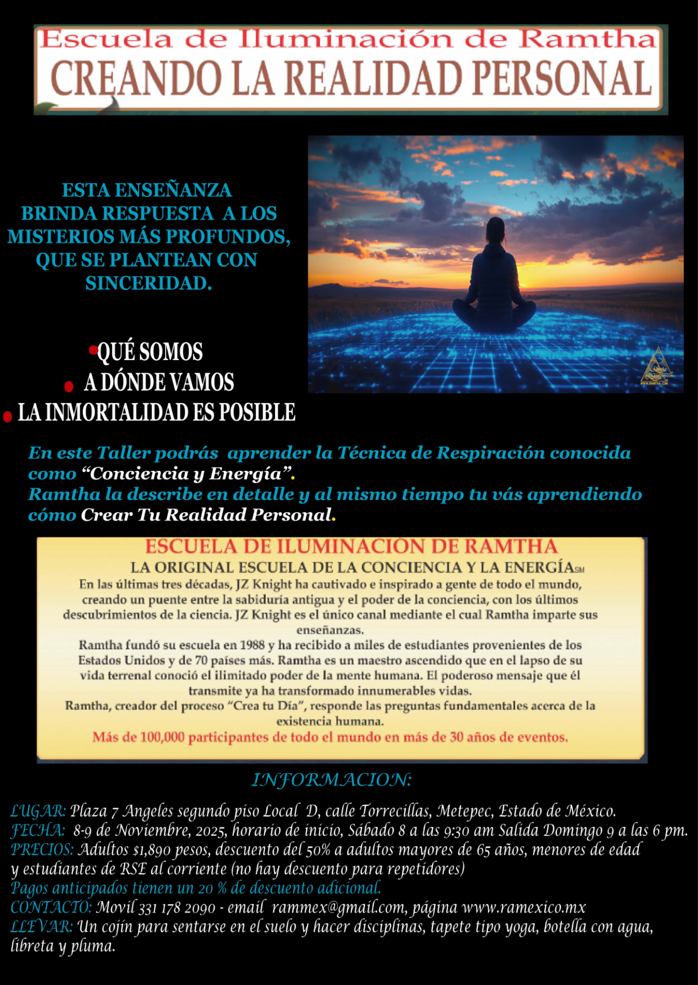 Una experiencia única, memorable y legendaria. Ramtha es un maestro ascendido que descubrió en su vida el poder maravilloso de la mente humana. En este taller, Ramtha, creador del proceso “Crea Tú Día,” te enseña la poderosa técnica de Consciencia y Energía para elevar y expandir la consciencia y responde las preguntas fundamentales acerca de la existencia humana y el potencial escondido dentro de cada uno de nosotros.